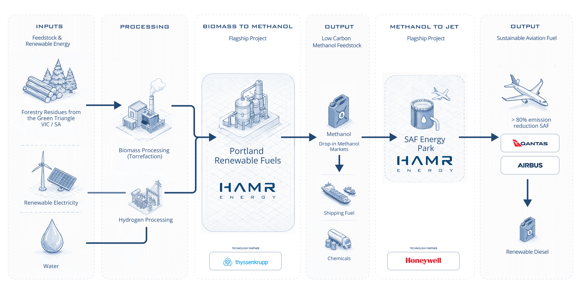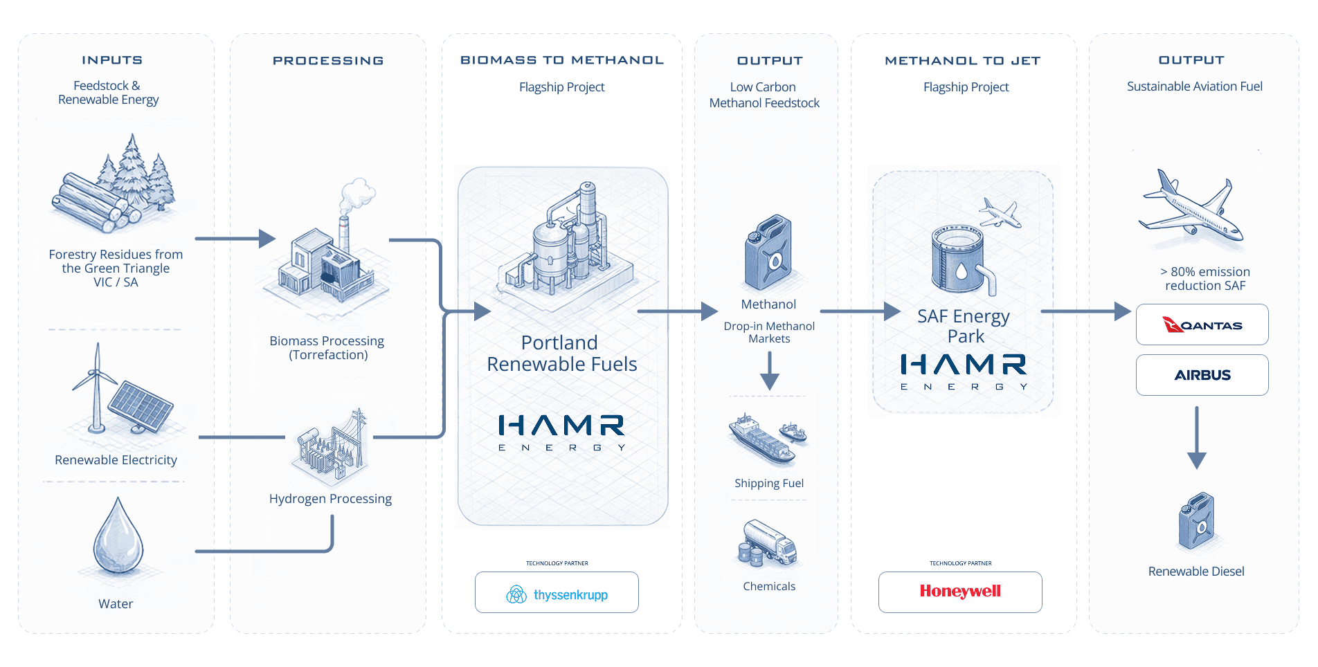 We‘re a vertically integrated clean fuels company, not a single-project developer. Our innovative hub & spoke model integrates dispersed forestry residues with centralised upgrading hubs making refined products like SAF and renewable diesel.
