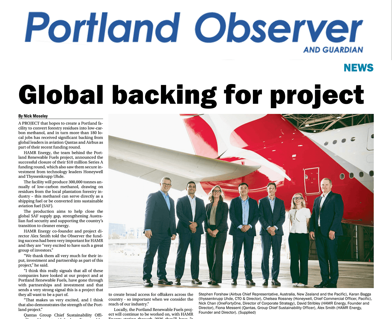 HAMR Energy Series A funding featured in Portland Observer. A project that hopes to create a Portlan facility to concetrt forestry residues into low carbon methanol and inturn more than 180 local jobs has received siginifcant backing from local leaders in aviation Qantas & Airbus as part of their recent funding round.